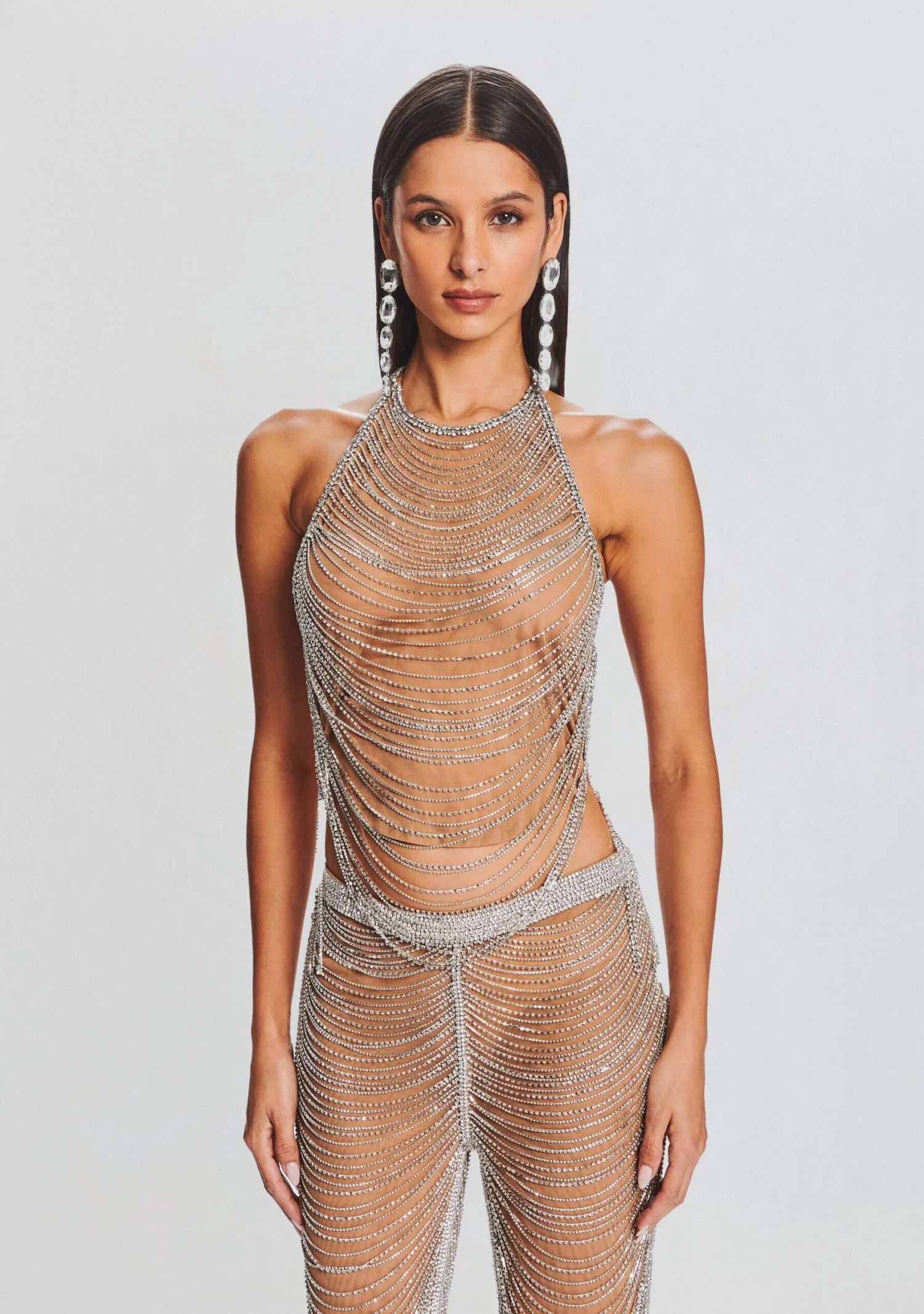 Embrace effortless elegance with our Delaney Top, featuring delicate draping and mesmerizing embellishments. The open back design adds a contemporary twist, making this top perfect for a night out or a special occasion. Let your style shine through with this ethereal and chic ensemble. Shown here in Tannin/Silver.