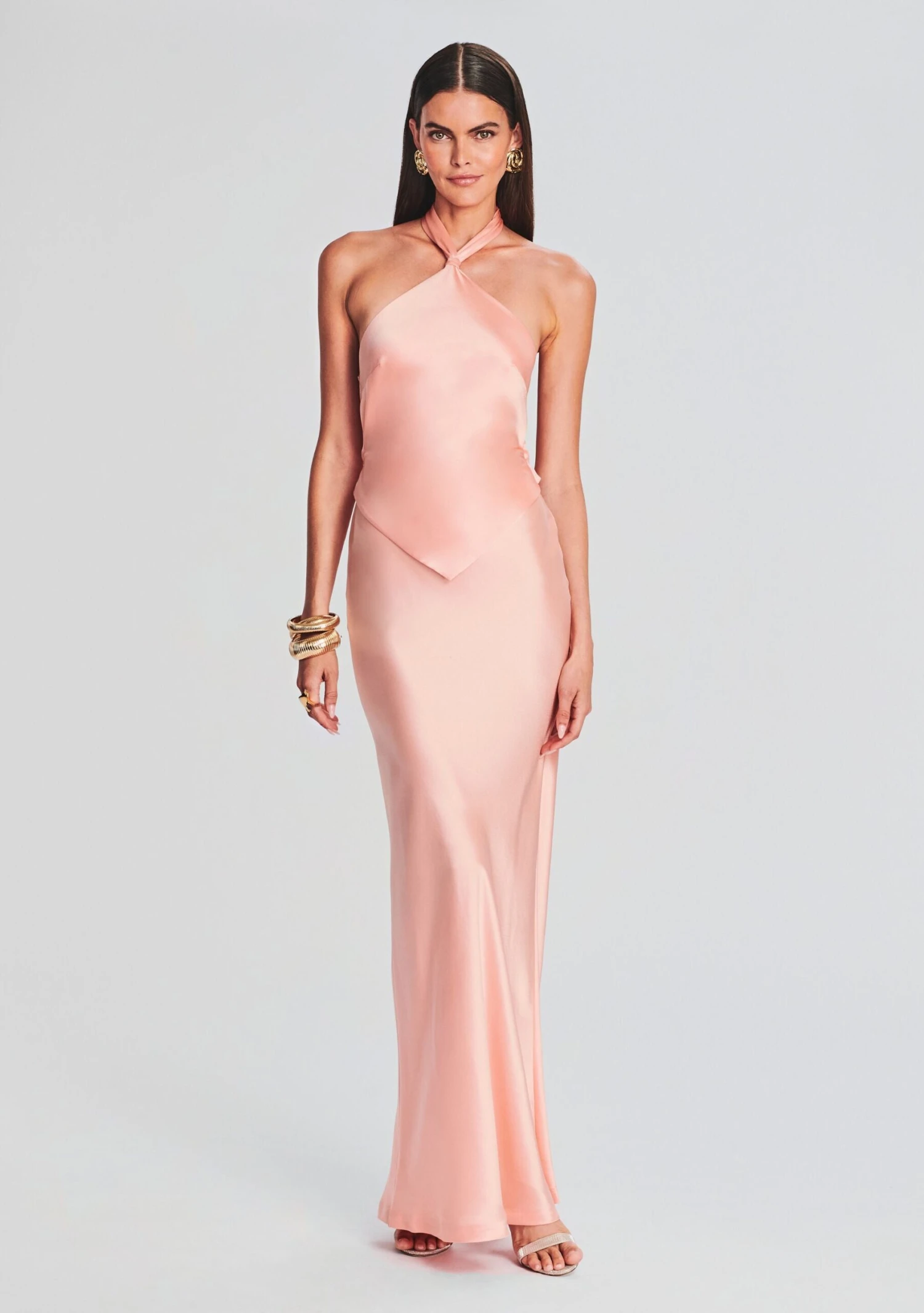 Step into a realm of elegant style with our ethereal Ester Dress. This halterneck top features two tie elements at its back and a mermaid silhouette skirt. Shown here in Cantaloupe.