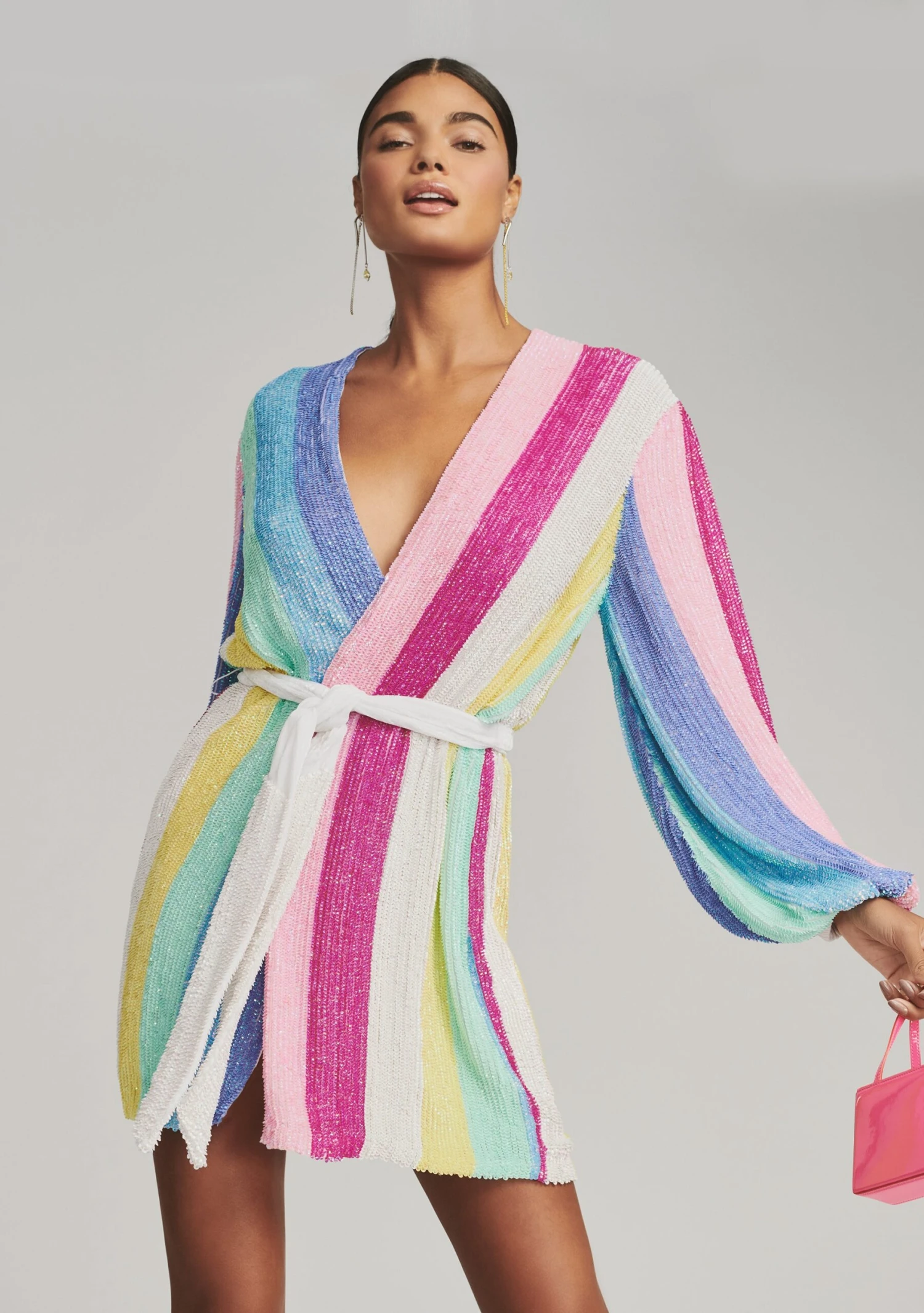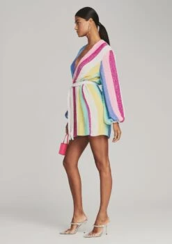 Introducing the ultimate party frock: The Gabrielle Robe. Enveloped in hand-stitched sequin embellishments, this whimsical multi-color striped silhouette features a wrap bodice, which is complemented by voluminous blouson sleeves and a velvet tie belt to cinch the waist. For a micro mini moment, we recommend sizing down. Shown here in Unicorn Stripe.